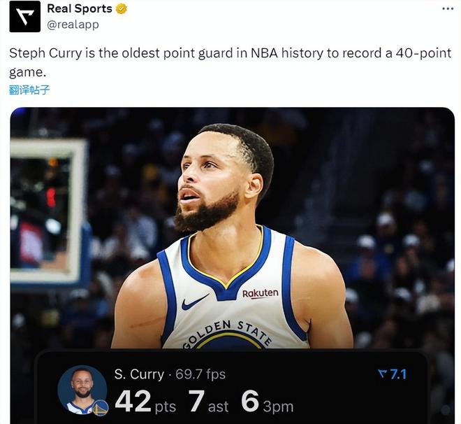 库里又创造了奇迹,37岁236天的他成为NBA历史上单场砍下40+最老的控卫。这是库里生涯第72次砍下40+,追平了杜兰特,并列NBA历史40+场次榜第9位。这是库里在30岁之后第42次砍下40+,排名NBA历史第二,仅次于乔丹的44场。